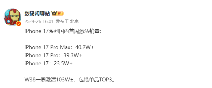 这还不是重点、重点在于iPhone 17系列三款机型在W38周激活量高达103万台左右。要知道这一周iPhone 17系列满打满算才卖了不到三天的时间。其中iPhone 17 Pro Max激活量达到40.2万台左右,iPhone 17 Pro激活量达到39.3万台左右,iPhone 17激活量达到23.5万台左右。作为对比去年同期iPhone 16 Pro Max的激活量为28.5万台左右,iPhone 16 Pro的激活量为31.5万台左右,iPhone 16的激活量为9.8万台左右。通过对比可以看到iPhone 17全系都在增长,且增长幅度非常大,占大头的还是iPhone 17 Pro系列。